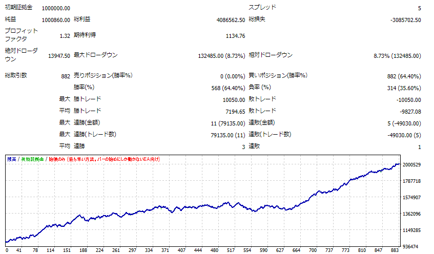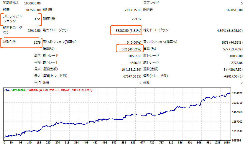 一番エントリー数が多いのは1分足の2,250回ですがなんか不自然です。5分足が一番勝率が高く利益も出せてエントリー数もまあまあです。